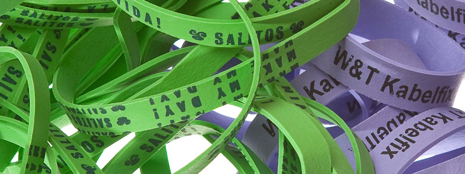 Elastici sono da decenni strumenti popolari per raggruppare, fissare o contrassegnare oggetti di uso quotidiano. Grazie alla loro elasticità e alla superficie leggermente adesiva, gli anelli di gomma tengono insieme i prodotti facilmente e senza lasciare residui. Le parti possono anche essere facilmente rimosse da un fascio senza che il fascio si sfaldi. Utilizzando un processo di stampa brevettato, gli elastici possono anche essere stampati in modo permanente presso H+D. Oltre alle loro proprietà tecniche, gli elastici hanno anche un efficace effetto pubblicitario. Gli H+D InfoStraps vengono spesso utilizzati anche come cinturino al polso. Ciò consente di controllare le autorizzazioni di accesso e di formare squadre durante gli eventi.